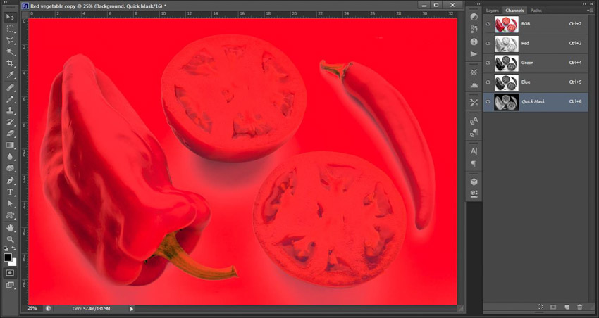 (4) In order to see that, we should activate the Quick Mask mode. It will seem to you that almost all of the picture is selected (colored in red).